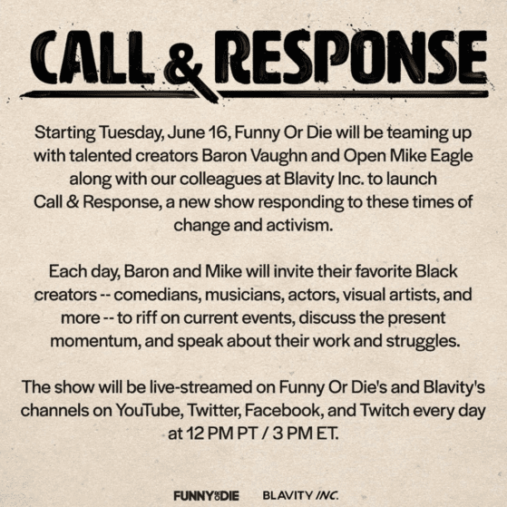 Whether you’re missing The New Negroes and/or you enjoy the beautiful comedy of Baron Vaughn and the fantastic music of Open Mike Eagle and/or you support the need for their to be more amplified representation of BIPOC in media, you’ll be happy to know that Baron and Mike are getting a brand new live-stream show Call & Response.